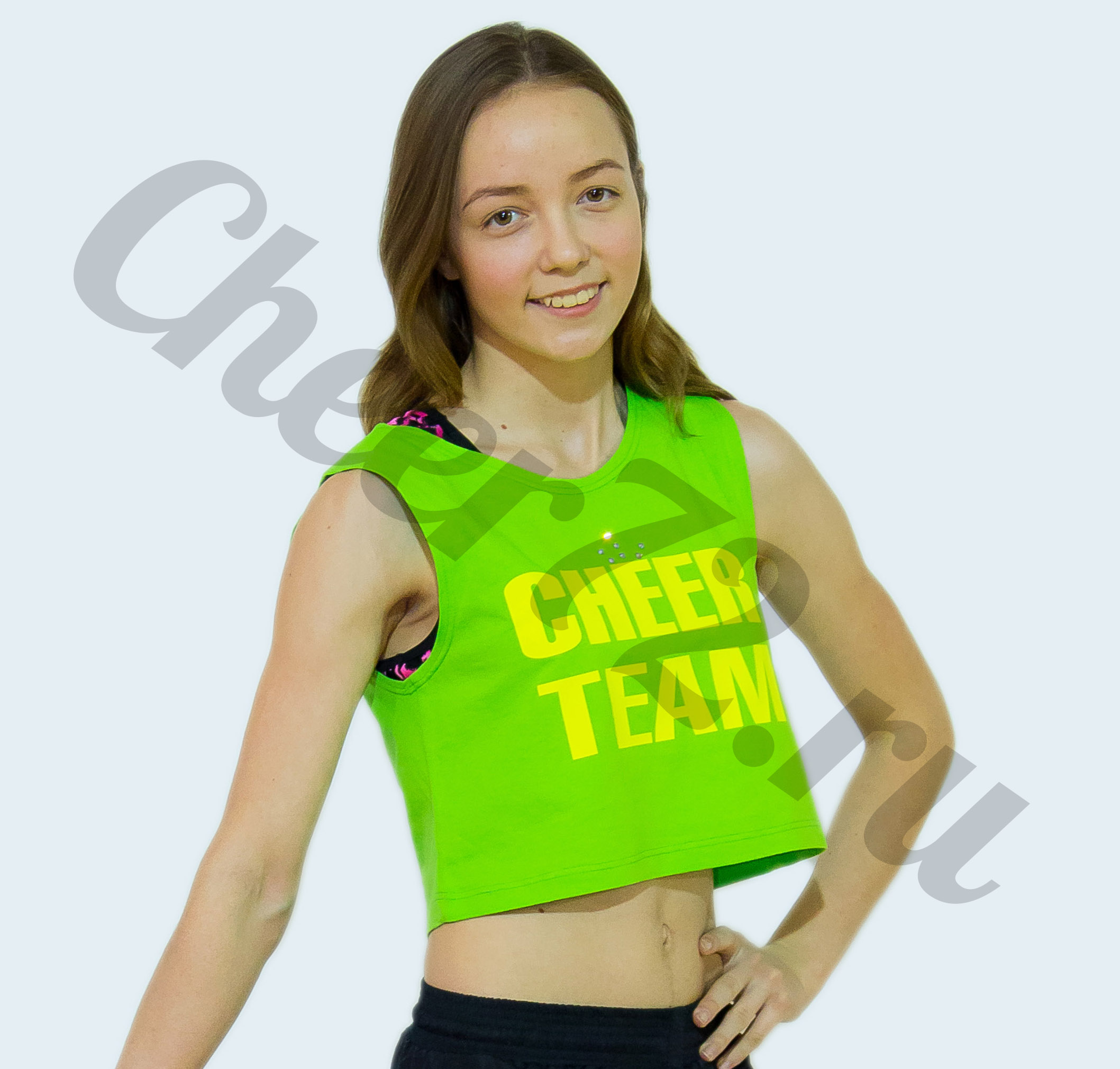 Ярко-зеленый топ с желтой надписью CHEER TEAM обязательно привлечет внимание.